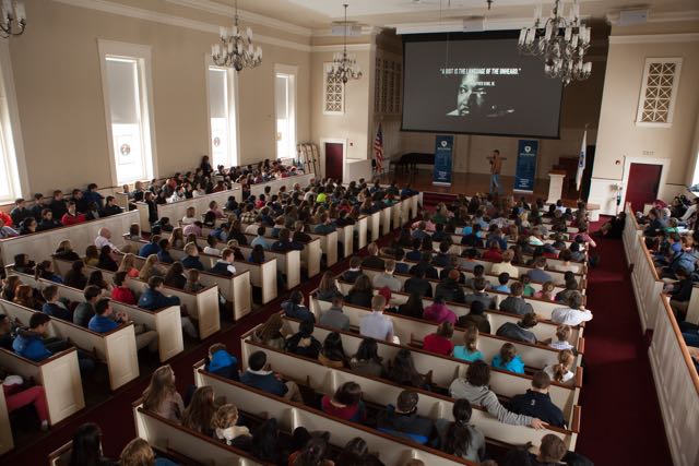 Speaking in the Phillips Stevens Chapel, with photos of conflicts flashing on the large projection screen behind him, Mr. Hamza asked his audience to embrace the spirit of the day—a common humanity.