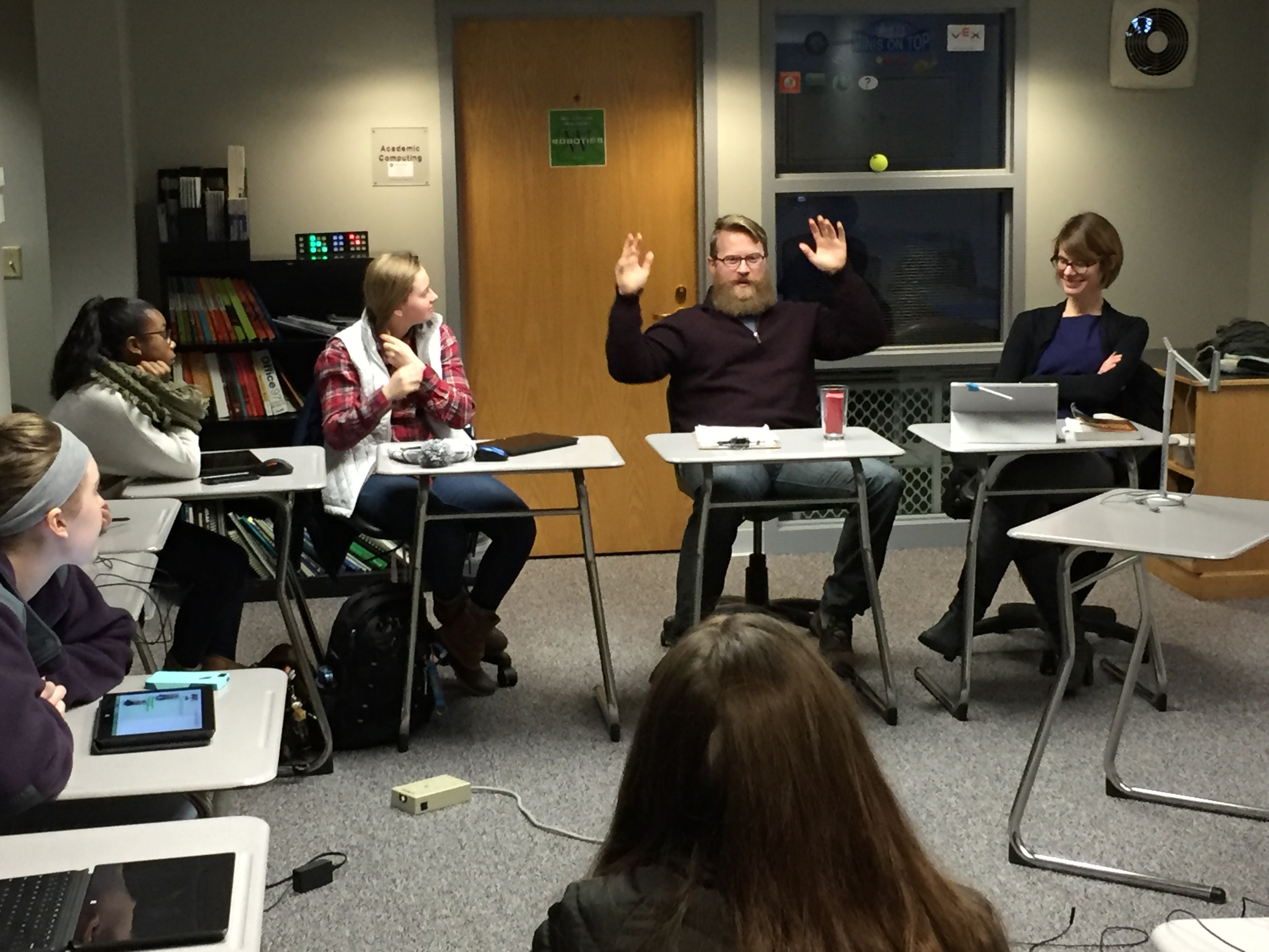 During his talk on January 14, Jesse Crafts-Finch ’01, owner of Gorilla Tactics, a video game design and development company, gave students tips on designing (“start small, then make it smaller!”), career paths (major in something that has marketability beyond just game design), and networking (send out 100 resumes, and the one call you’ll get is from the person who knew your college roommate).