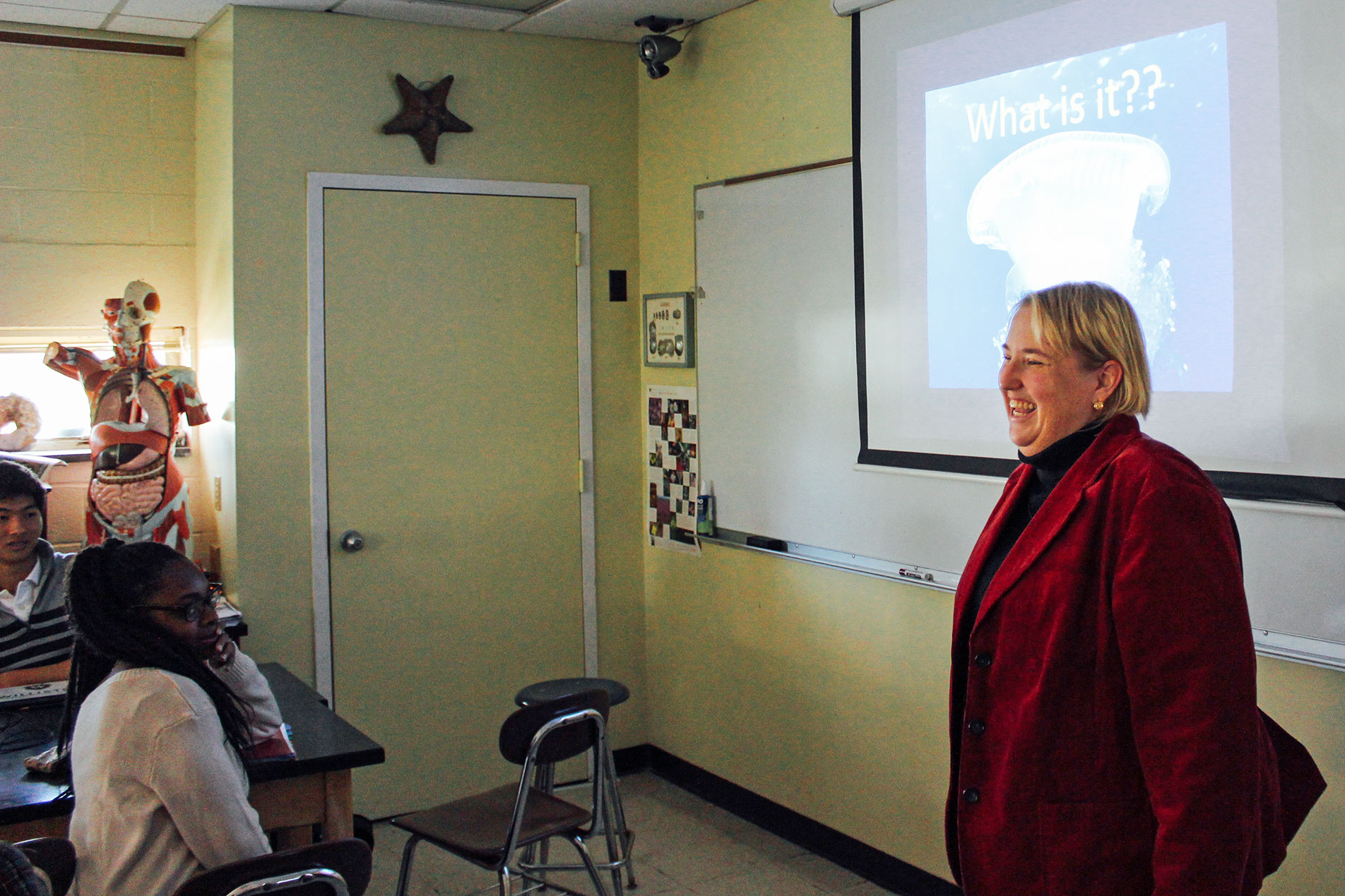 On Friday, Ms. Dore returned to Scott to talk to AP Environmental Sciences class about sea turtles. She then headed over to Elizabeth Kay’s biology class for a marine animal version of “what am I?”
