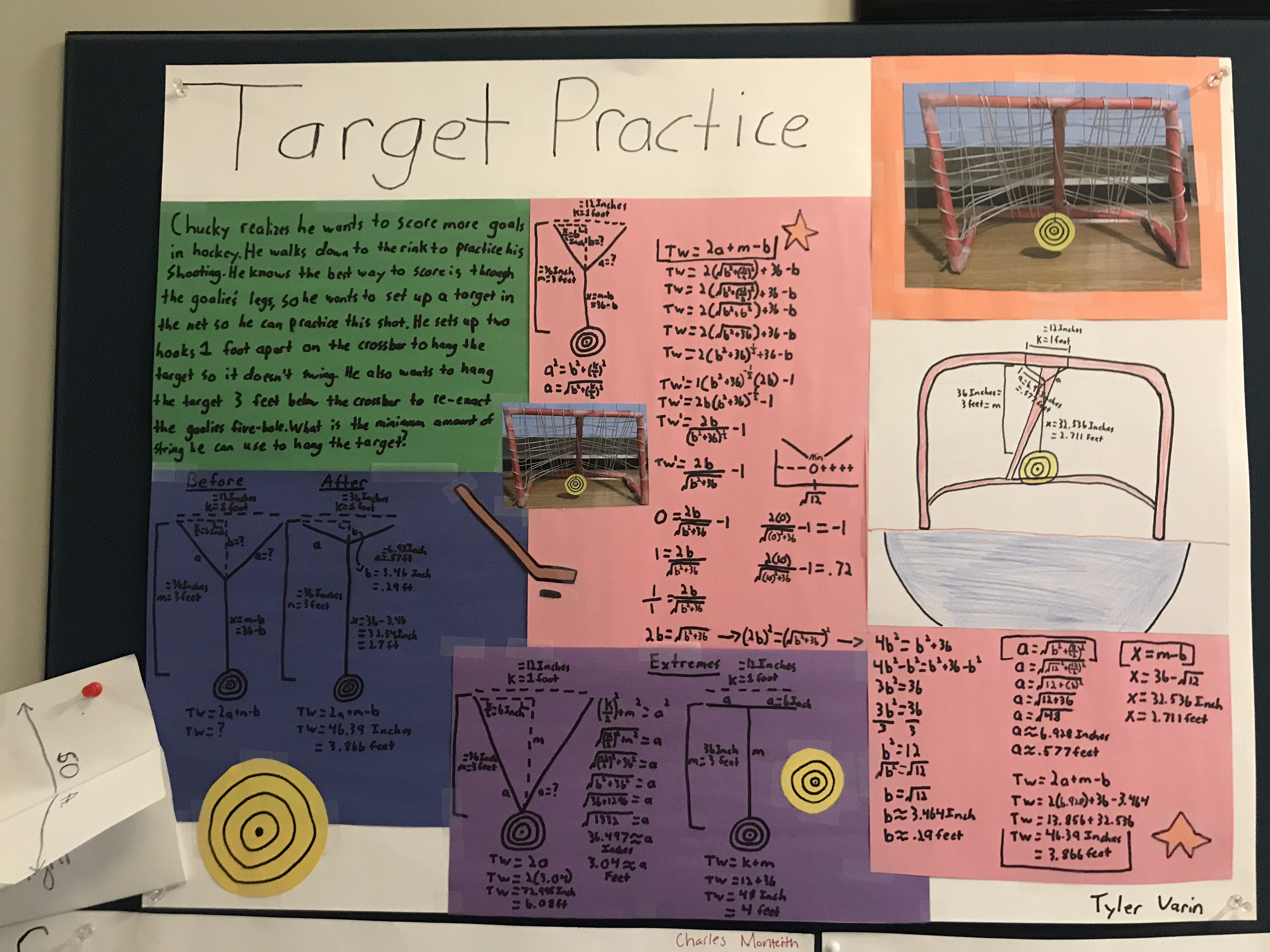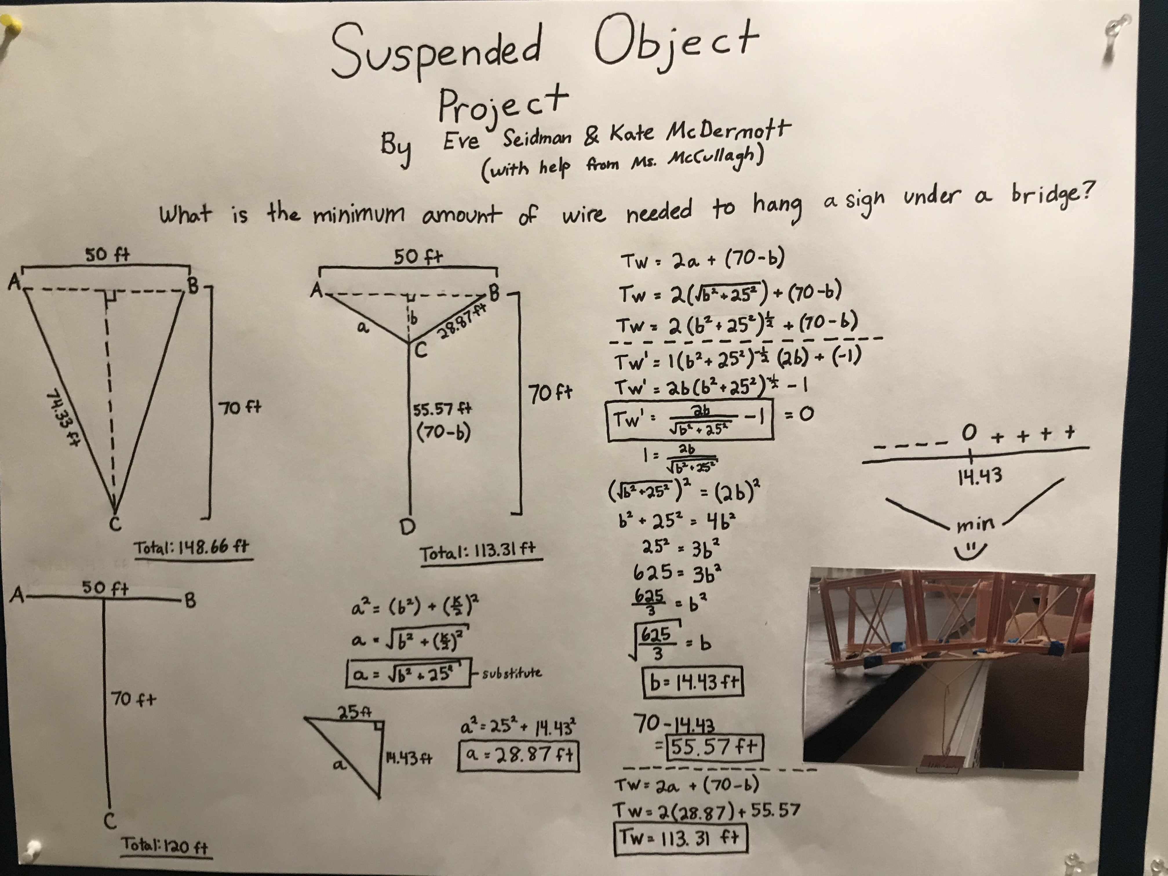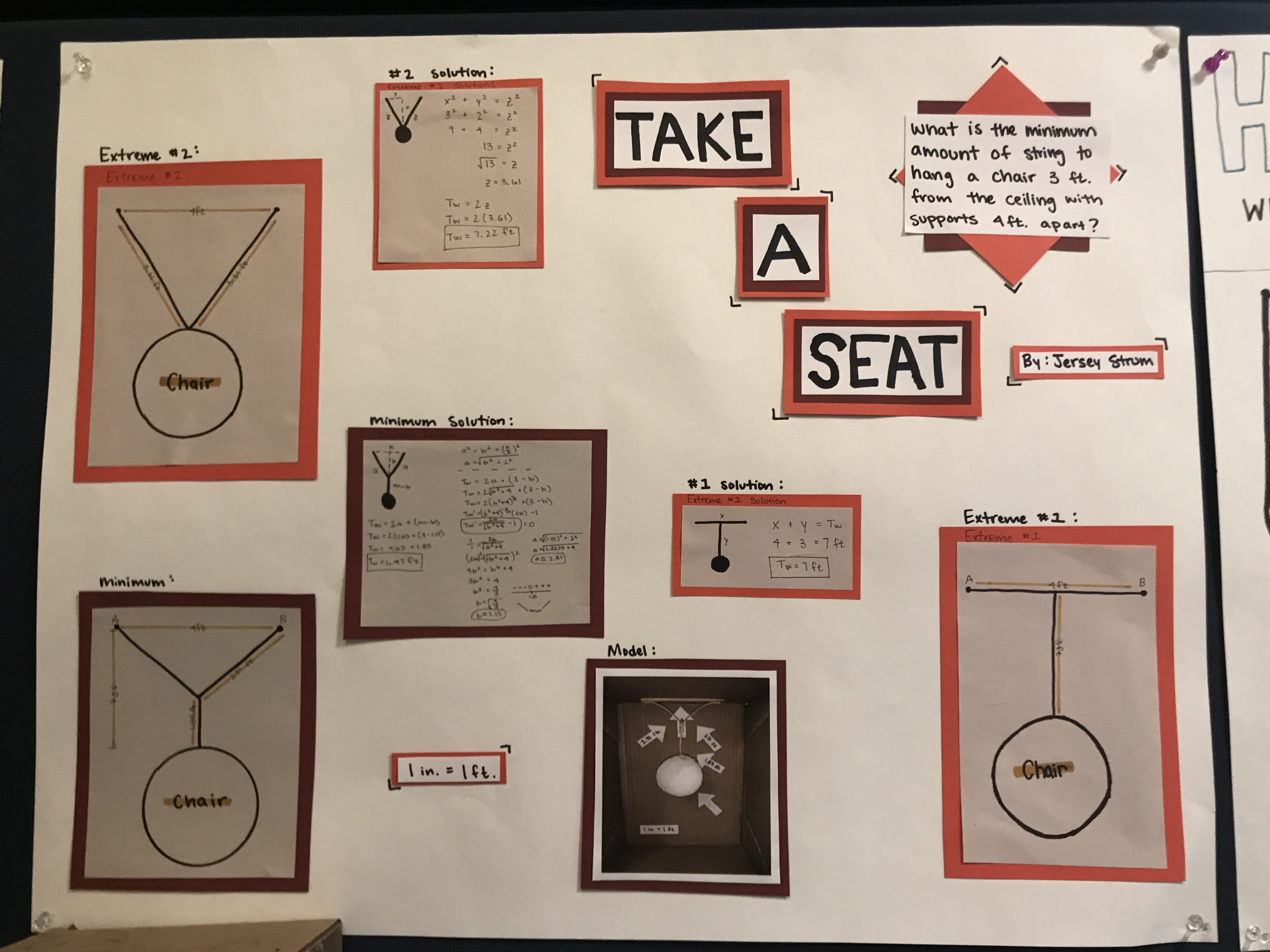 Calculus students displayed their work on a challenging optimization problem. They were asked to plan a design to hang “something” from “somewhere”, and then determine the least amount of rope or wire needed.