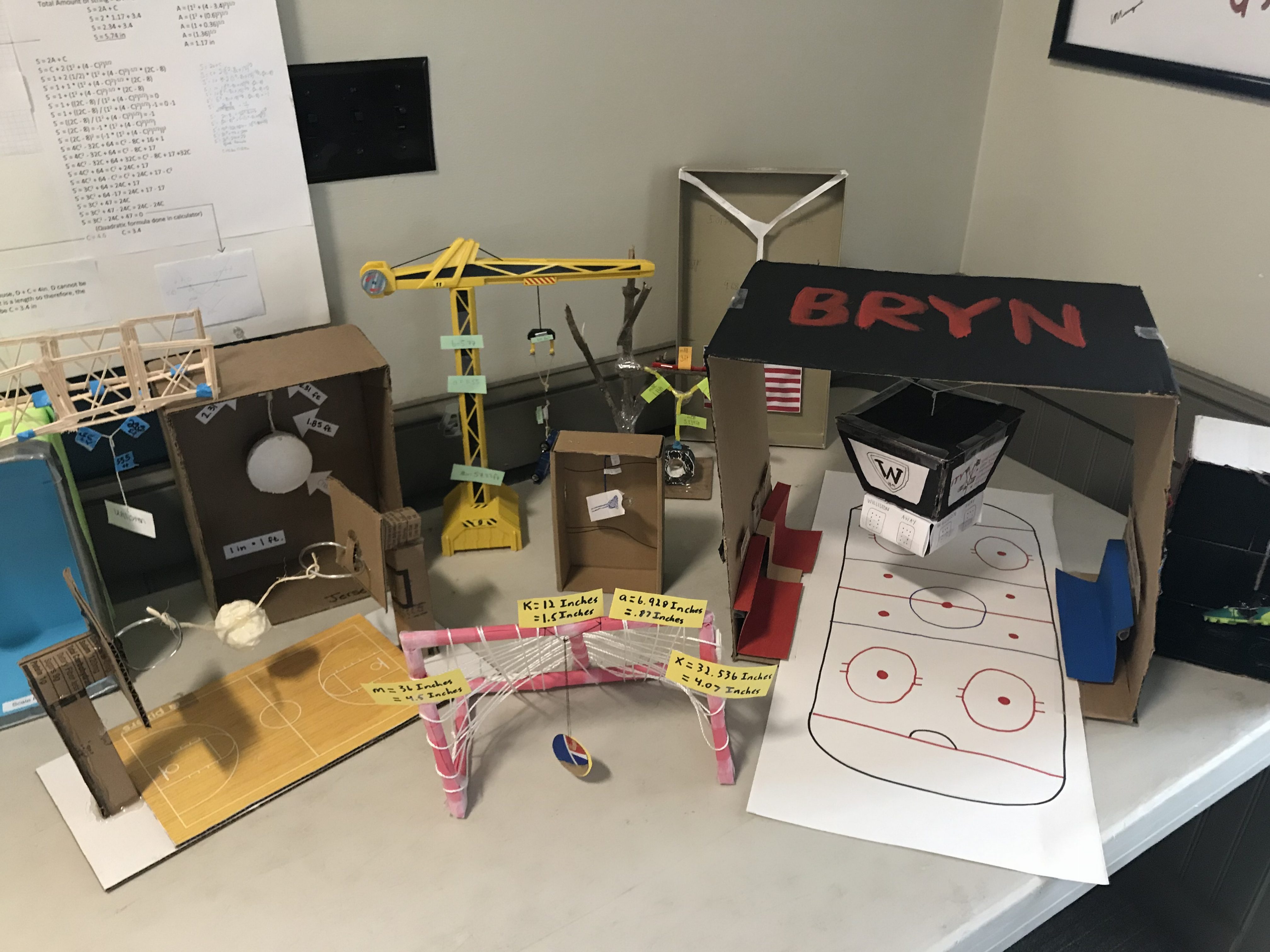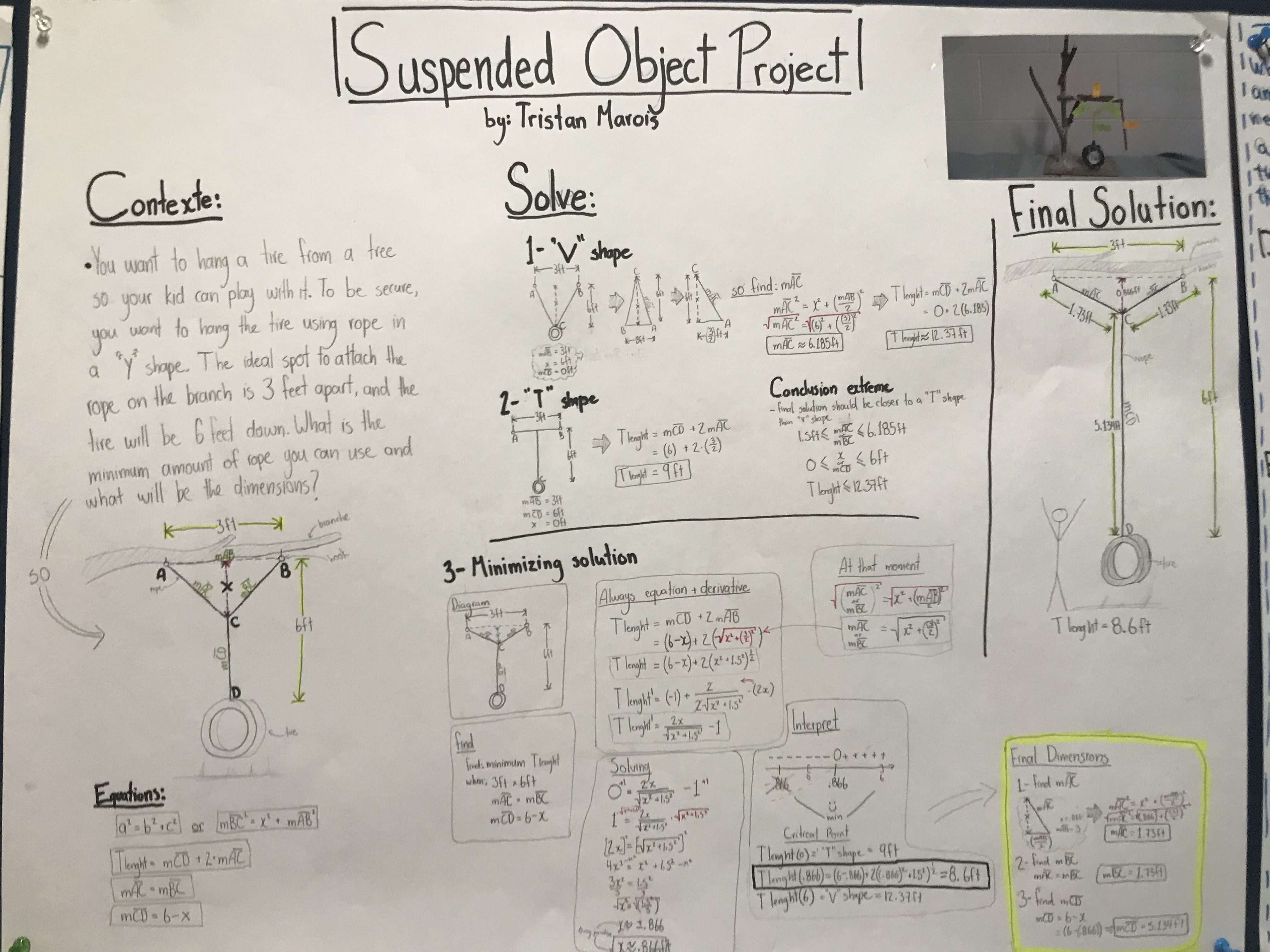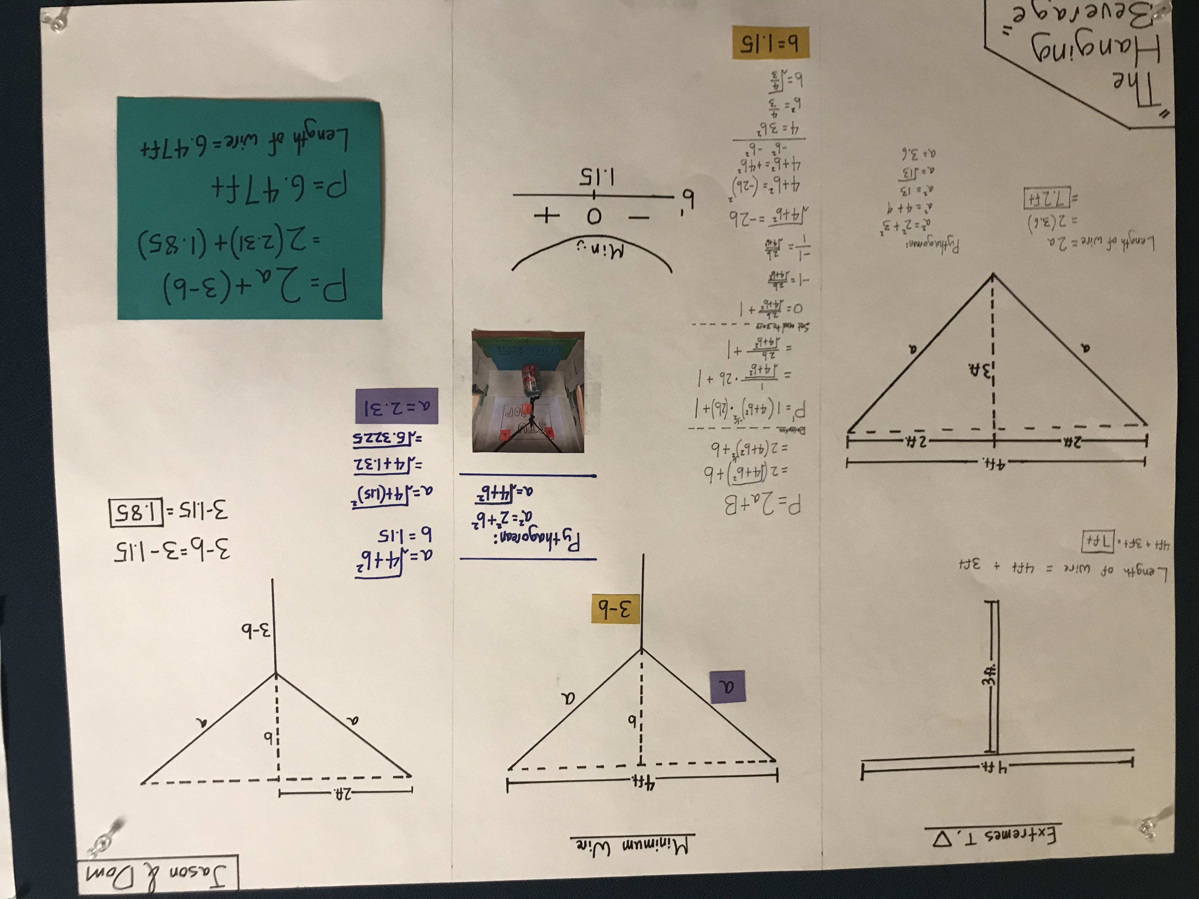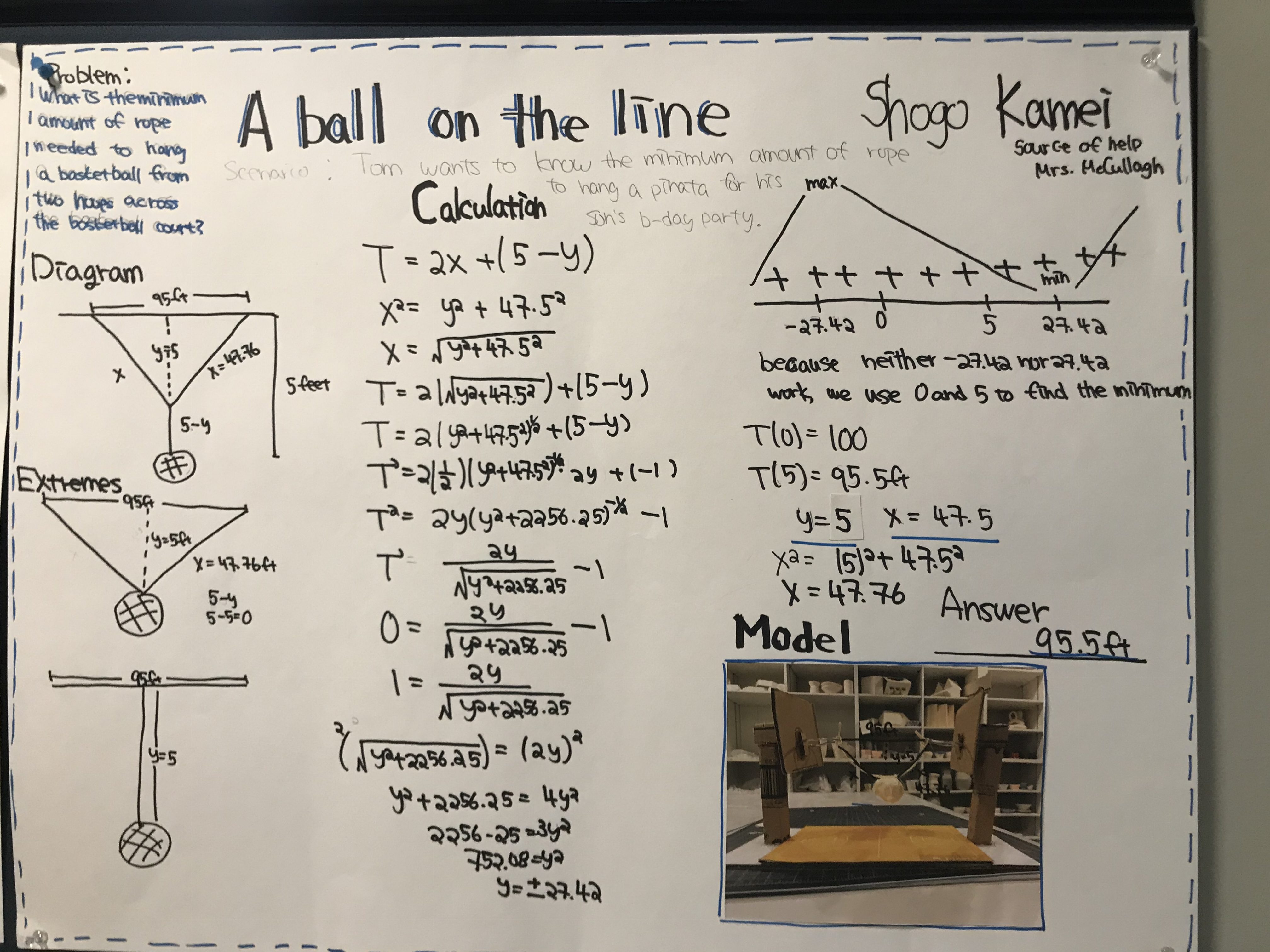 Calculus students displayed their work on a challenging optimization problem. They were asked to plan a design to hang “something” from “somewhere”, and then determine the least amount of rope or wire needed.